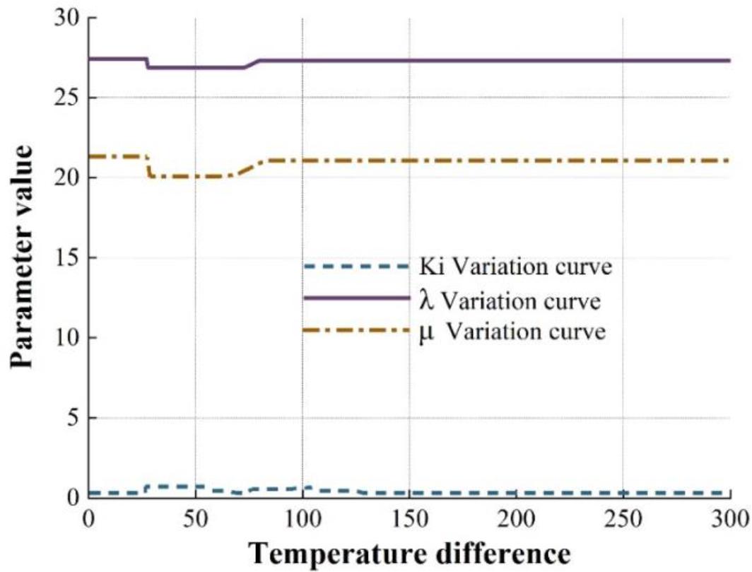 Fig. 4 and Fig. 5 are the change curves of five parameters Kp, Ki, Kd,λ,μ of the fuzzy genetic PID controller in the process of cooling water temperature difference control, observing the curve diagram, we can easily find that these parameters are constantly changing before the cooling water temperature difference reaches the set value, and basically remain unchanged after the temperature difference reaches the set value.