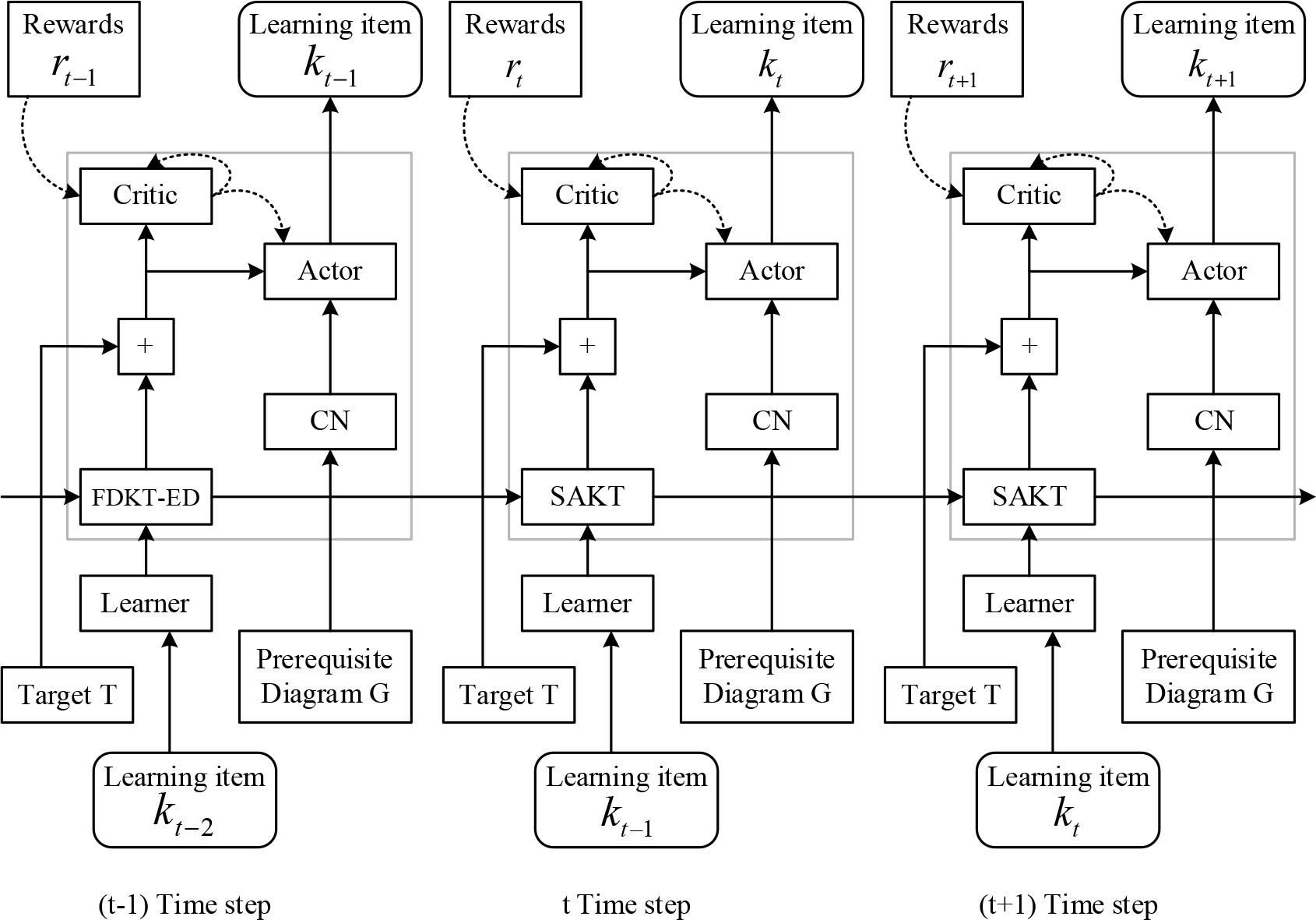 RL4ALPR is divided into the following four sub-modules: knowledge level modeling (FDKT-ED), candidate learning item screening (CN), reinforcement learning recommender (A2C), and reward computation. At each time step, FDKT-ED explores the learner’s potential knowledge level based on his/her historical interactions. CN filters a set of candidate learning items based on the learning items answered by the learner in the previous time step in a prerequisite graph, which serves as the action space for A2C. A2C provides the learner with the learning items to be answered. The reward is passed to A2C for improving the recommendation strategy.