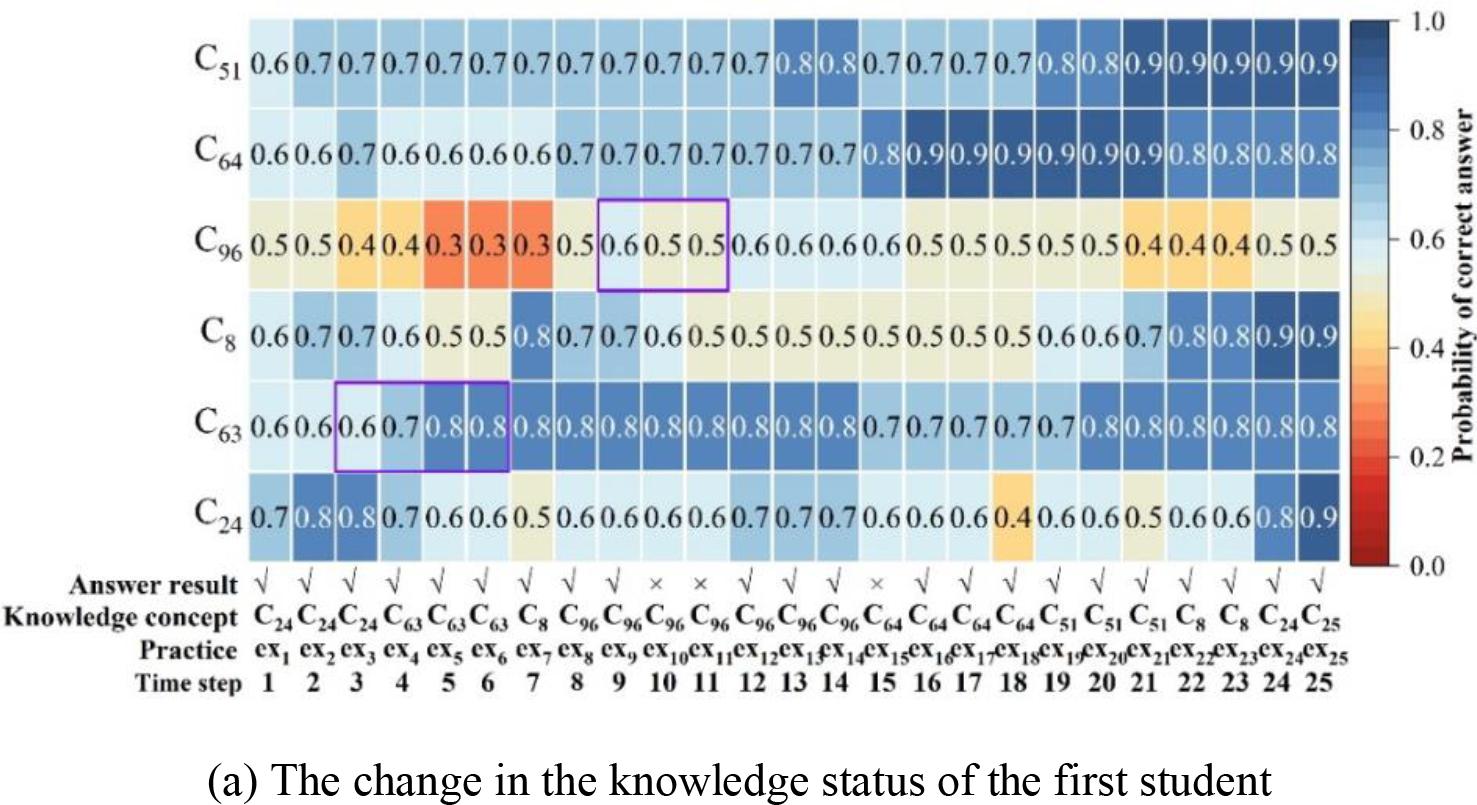 Visualization of the evolution of the knowledge state was manipulated: first, a sequence of historical question-answering interactions of 2 students was selected from the ASSIST15 dataset. Subsequently, knowledge tracking was performed for each of these 2 sequences using the FDKT-ED model. Finally, the knowledge states were visualized. The visualization results of the knowledge state changes of the 2 students are shown in Figure 4, where Figures (a) and (b) represent the heatmaps of the knowledge state changes of the 1st and 2nd students, respectively. The data in the heatmap color blocks were rounded and converted to retain 2 valid decimals.