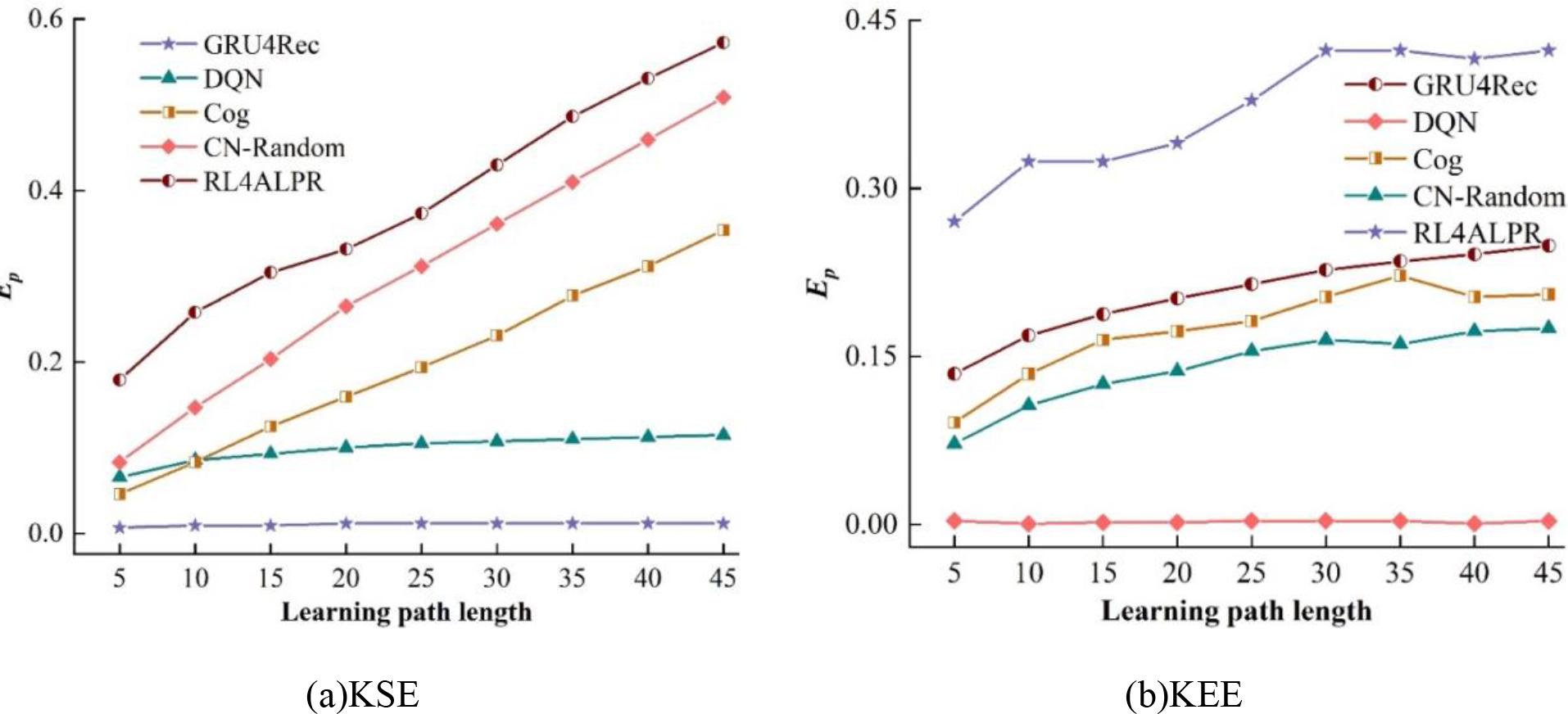 Experimental dataset The experimental dataset used in this section is from Environment Modeling Since the intelligent body (Agent) in reinforcement learning needs to interact with an environment model in order to train the model, which cannot be supported by the existing offline data. Therefore, in this paper, two different environment models are designed to realize the closed loop of reinforcement learning process for intelligent agents, namely: the knowledge structure-based environment model (KSE) and the knowledge evolution-based environment model (KEE). Evaluation Metrics In order to obtain more comprehensive results, both logic and cognitive state enhancement will be used as evaluation indexes. In this paper, the students’ college public English test score enhancement Ep, obtained from the environment model, is used as cognitive state enhancement. At the same time, several educational experts are invited to score the learning logic of the path planned by the RL4ALPR model from the point of view of whether it conforms to the general cognitive law, so as to validate the model effect from another angle. Benchmarking method In addition, in order to prove the effectiveness and robustness of the RL4ALPR model proposed in this paper, it was compared with the following benchmark methods: KNN: This model finds the other learners who are most similar to the learner by comparing the cosine distances of the learning paths, and decides the next learning program for the new learner based on the learning paths of the other learners. GRU4Rec: GRU4Rec is a classic session-based recommendation model. The input of the model is a sequence of sessions, while the output is a probability distribution of learning items that appear in the next step. MCS: Monte Carlo Search (MCS) can be combined with knowledge tracing models to form a search method. That is, the knowledge tracing model predicts the learning effect of each searched path and is used as a criterion to judge how good or bad the learning path is. DQN: Reinforcement learning is utilized to solve the learning path recommendation problem, which requires rich domain experts to design the state transfer matrix in the MDP and set the accurate initial state at the same time. Instead of discrete state and transfer matrices and simple Q-learning in MDP, DQN uses knowledge tracking model and deep value network respectively. CN-Random: a number of candidate learning items are selected based on a cognitive navigation approach, and a learning item is recommended from them in a uniformly sampled manner as it is taken. This method is a simple knowledge structure based recommendation method. Cog: Similar to CN-Random, a number of candidate learning items are selected based on cognitive navigation, but the difference is that Cog samples from the candidates in a weighted way. In this paper, we use MXNet to implement the deep learning models and train each of the benchmark models and the models in this paper on a Linux server with quad-core 2.0GHz Intel Xeon E5-2620 CPUs and a Tesla K20mGPU.