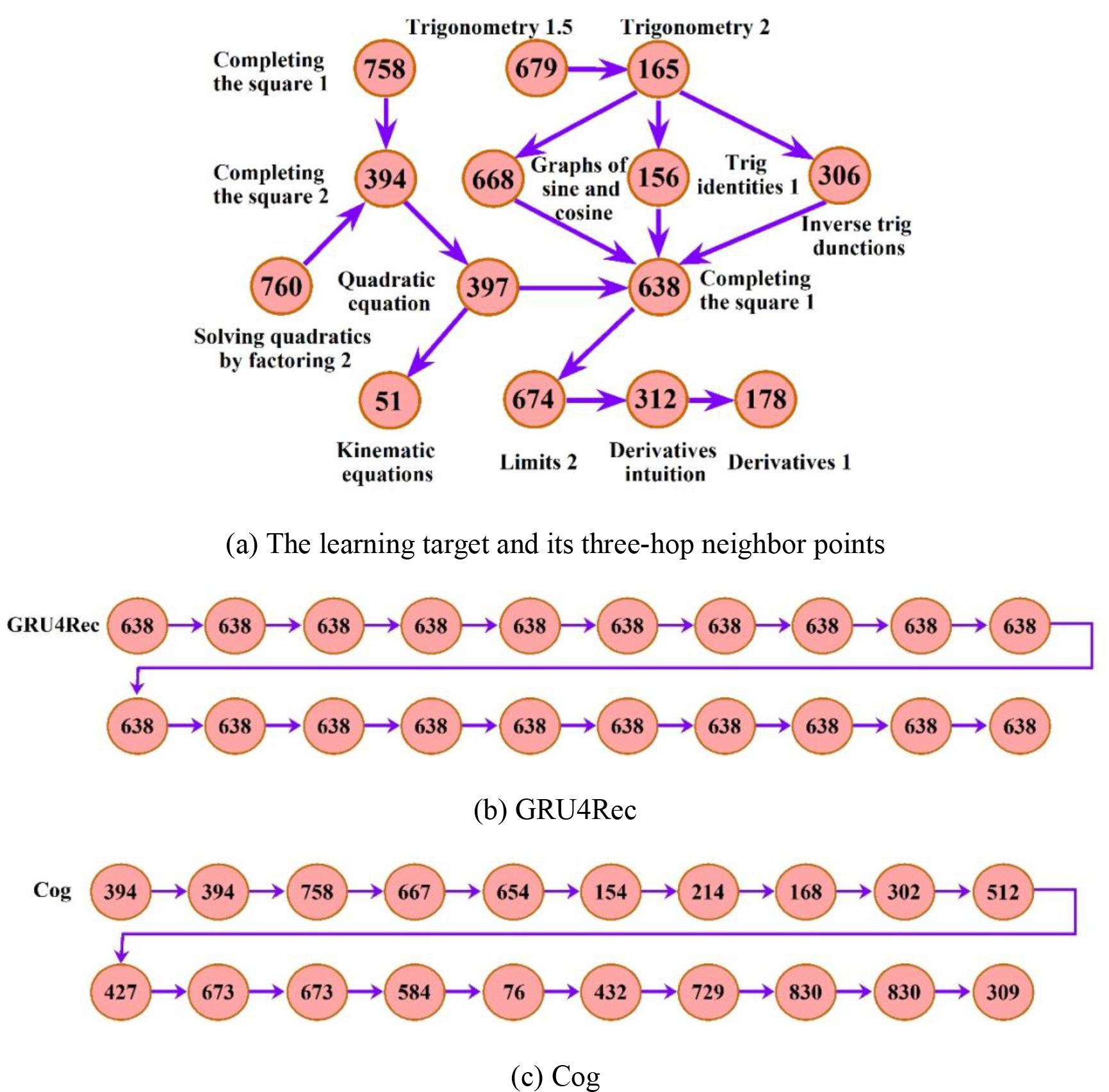 Cognitive Enhancement Evaluation Based on Environmental Modeling According to the statistics, the median number of exercises included in a single learning stage is 25, and the length of the paths to be recommended for learning public English at university is uniformly set to 25. The average cognitive state enhancement of the paths recommended by all the models to the learners, As can be seen from Table 2, the proposed RL4ALPR model in this paper performs the best, with its Assessment of the Logic of Pathway Learning Based on Expert Ratings Inspired by existing research work, this paper invites six experts in the field of education who are familiar with learning path planning to rate the results of the recommended learning paths for university public English generated by various methods in terms of learning logic. The scores ranged from 1 to 5, with higher scores representing greater logic. The experts rated the 200 samples of recommendations based on their own experience and in terms of whether the paths conformed to general cognitive patterns. Each sample contains the learner’s historical learning records, learning goals, and recommended learning paths. Four benchmark models, GRU4Rec, DQN, CN-Random, and Cog, were selected to compare with the methods in this paper, which differ in their cognitive state and knowledge structure modeling. The results of the path learning logic assessment based on expert ratings are shown in Figure 5. As can be seen in Figure 5, the recommended results of RL4ALPR are most consistent with what human experts consider to be logical for learning, outperforming all benchmark models. In addition, it can be observed that the approach with cognitive navigation received higher scores in the expert evaluation, which suggests that cognitive navigation helps to maintain the logic of the learning path. In addition, the comparison reveals that the scores given by different experts for the same sample are sometimes very different. Moreover, comparing the results of Learning path length affects validation The median length of an exercise sequence in a learning phase is 25, so it can be conjectured that the relatively reasonable learning length of a learning phase in KEE should be close to this value. In this paper, we verify this conjecture through experiments, and also conduct extensive experiments on KSE. The results of the validation of the impact of learning path length are shown in Fig. 6, (a) and (b) represent the results of the impact of learning path length on Case Study In this paper, a visualization example is given as shown in Fig. 7. For better understanding, this paper draws a sub-diagram in Fig. 7 including the learning target and its three-hop neighbor points as shown in Fig. (a). And Figures (b)~(d) represent the learning paths planned by GRU4Rec, Cog, and RL4ALPR models, respectively. In this example, a learner wants to master the learning item numbered 638 (completing-he_square-1), and his/her historical learning records are {(638,0), (638,0), (638,0), (638,0), (638,0)}. It is easy to see that the learner has been repeating his/her attempts to learn 638, but has not been able to break through. This indicates that he/she is having some difficulty in trying to master that learning objective. In order to help this learner, different approaches give different learning paths. The path recommended by GRU4Rec is that the learner keeps repeating the learning of the final objective even though it is found through the previous analysis that he/she may have learning difficulties. Whereas, most of the learning items in the path recommended by Cog are far away from the learning goal (not even near the learning goal). The RL4ALPR method in this paper, on the other hand, first allows learners to review the learning items with prerequisite relationships, and then to try to attack the learning goal while reviewing the prerequisite entities. It is easy to see that RL4ALPR plans a more reasonable and effective learning path for learners.