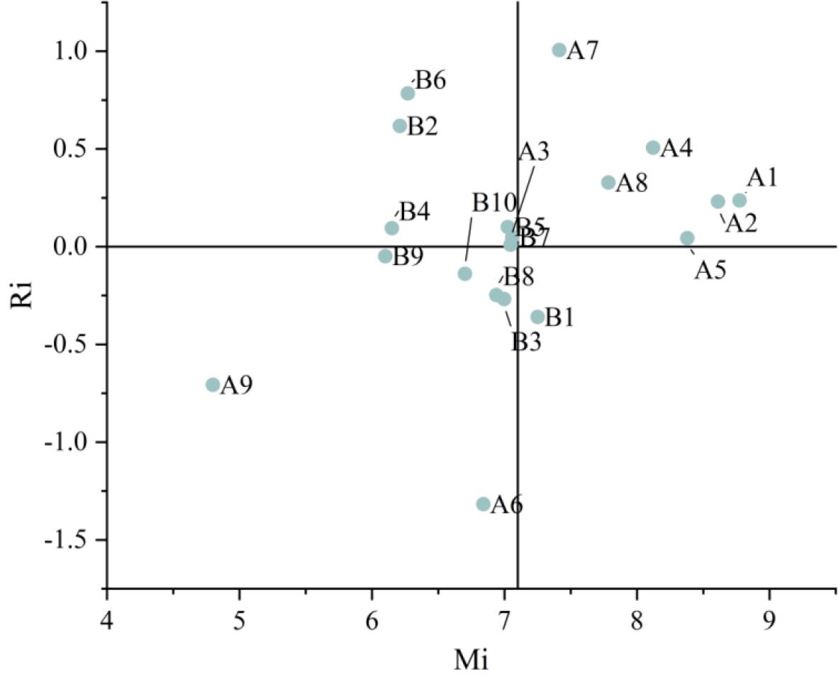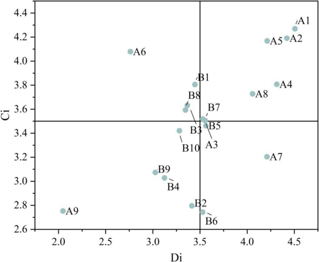 Using the formula to get the degree of influence Di, the degree of being influenced Ci the degree of centrality Mi the degree of cause Ri of each factor, the specific total influence relationship of all the indicators is shown in Table 1. Example analysis: the cultural and historical theme (A1) has the highest degree of influence of 4.506, which indicates that the rural revitalization literature on this theme has a higher likelihood of causing international dissemination. The non-nodal selection (A9) has the lowest influence degree of 2.047, indicating that this factor has the least influence on the dissemination of literature. Cultural-historical themes (A1) were affected by the highest influence degree value of 4.269, indicating that they were influenced by other factors. There is a significant emotional bias (B6) was shown to have the lowest influence value of 2.743, indicating that it is not easily influenced by other factors.