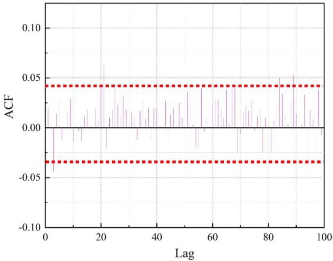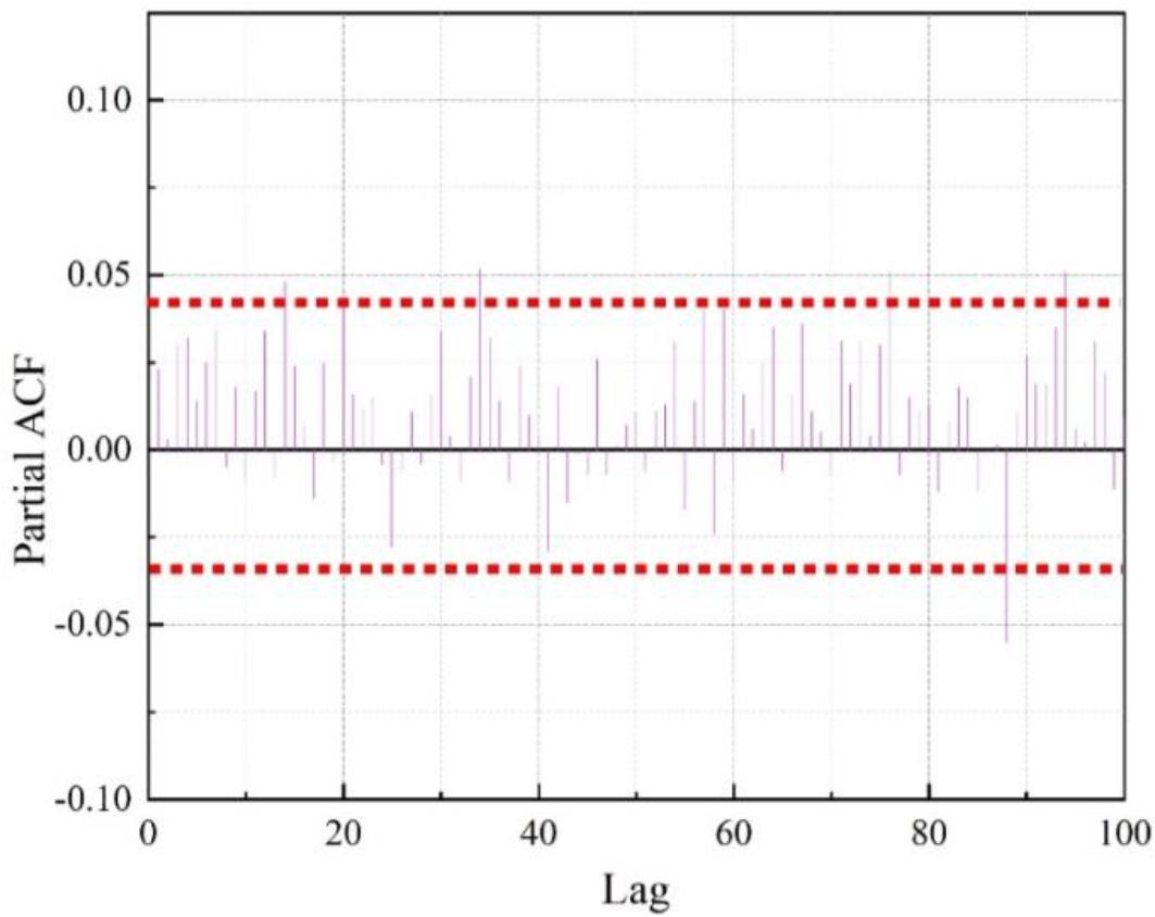 The autocorrelation results are shown in Fig. 4, and the partial autocorrelation results are shown in Fig. 5. It can be seen that the autocorrelation value and partial autocorrelation value within the lag of 100th order have the phenomenon of exceeding the confidence boundary, which can basically be judged as trailing. According to the relevant decision rules, it is initially defined as an ARIMA model.