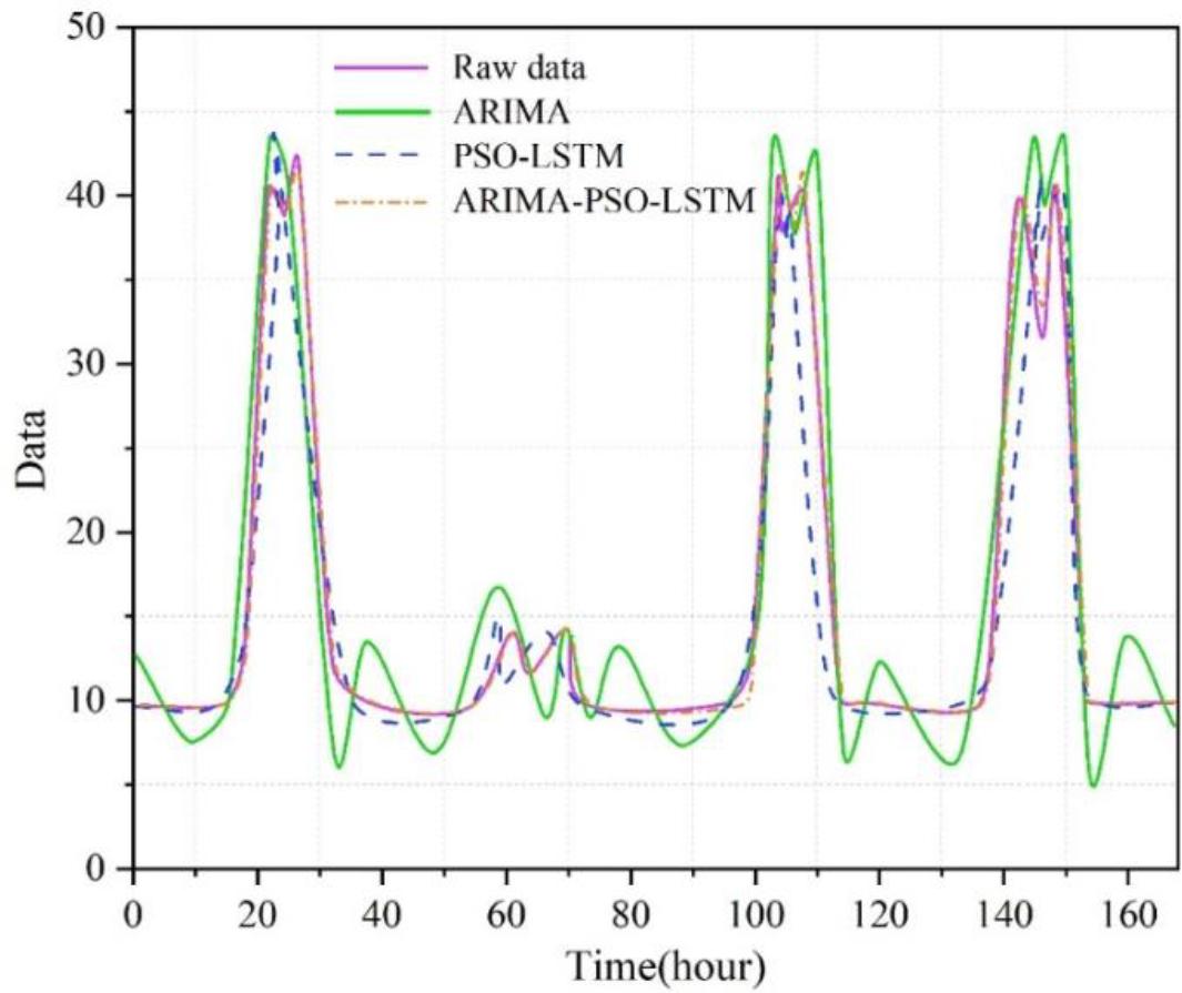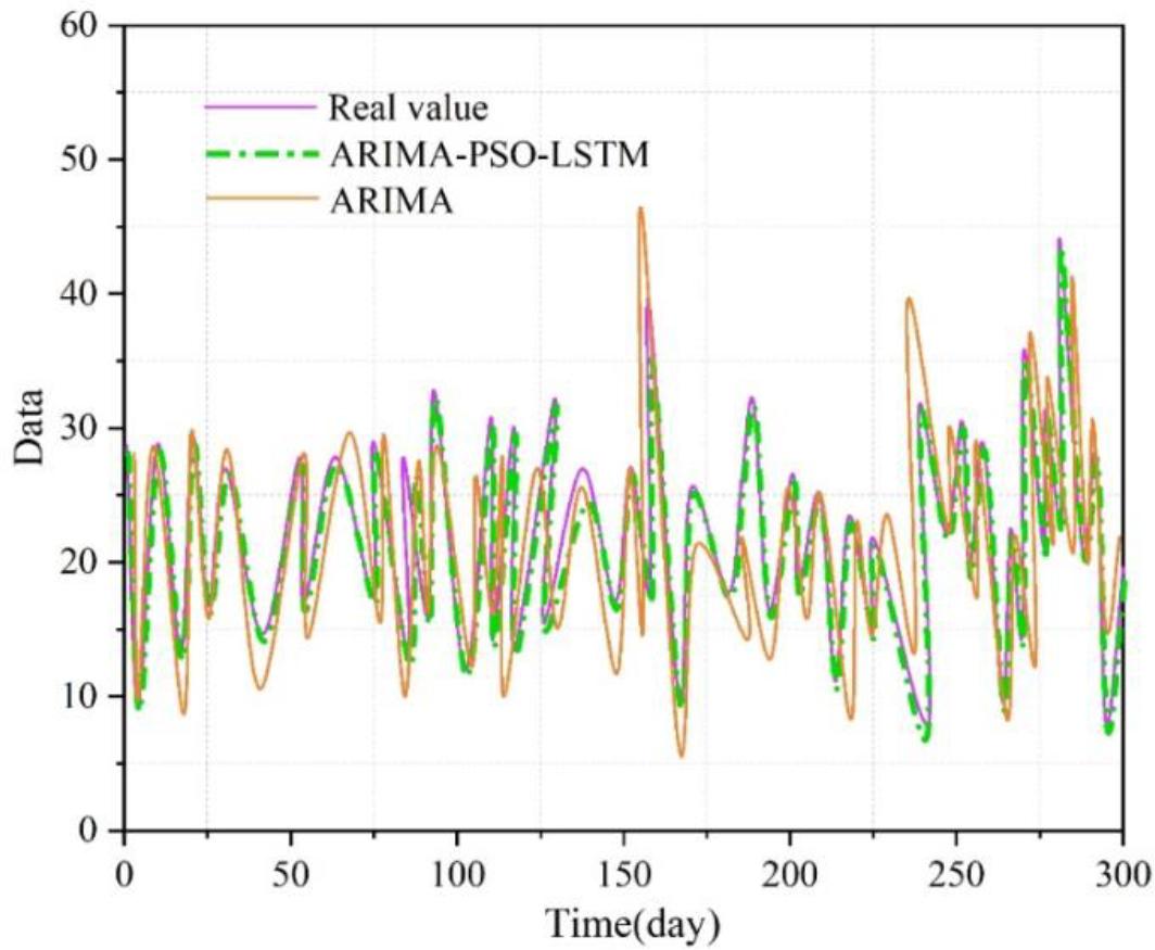 In order to better show the advantages of finding hyperparameters through the optimization-seeking algorithm, ARIMA and the optimized ARIMA-PSO-LSTM model are compared horizontally in this paper. Figure 8 shows the prediction results of ARIMA and ARIMA-PSO-LSTM models. As can be seen from the figure, the ARIMA-PSO-LSTM model is more closely related to the real values, which shows that the ARIMA-PSO-LSTM model can better simulate the prediction of the real values. It can be seen that compared with the single ARIMA model, the combined ARIMA-PSO-LSTM model established in this paper has better prediction accuracy and prediction effect.