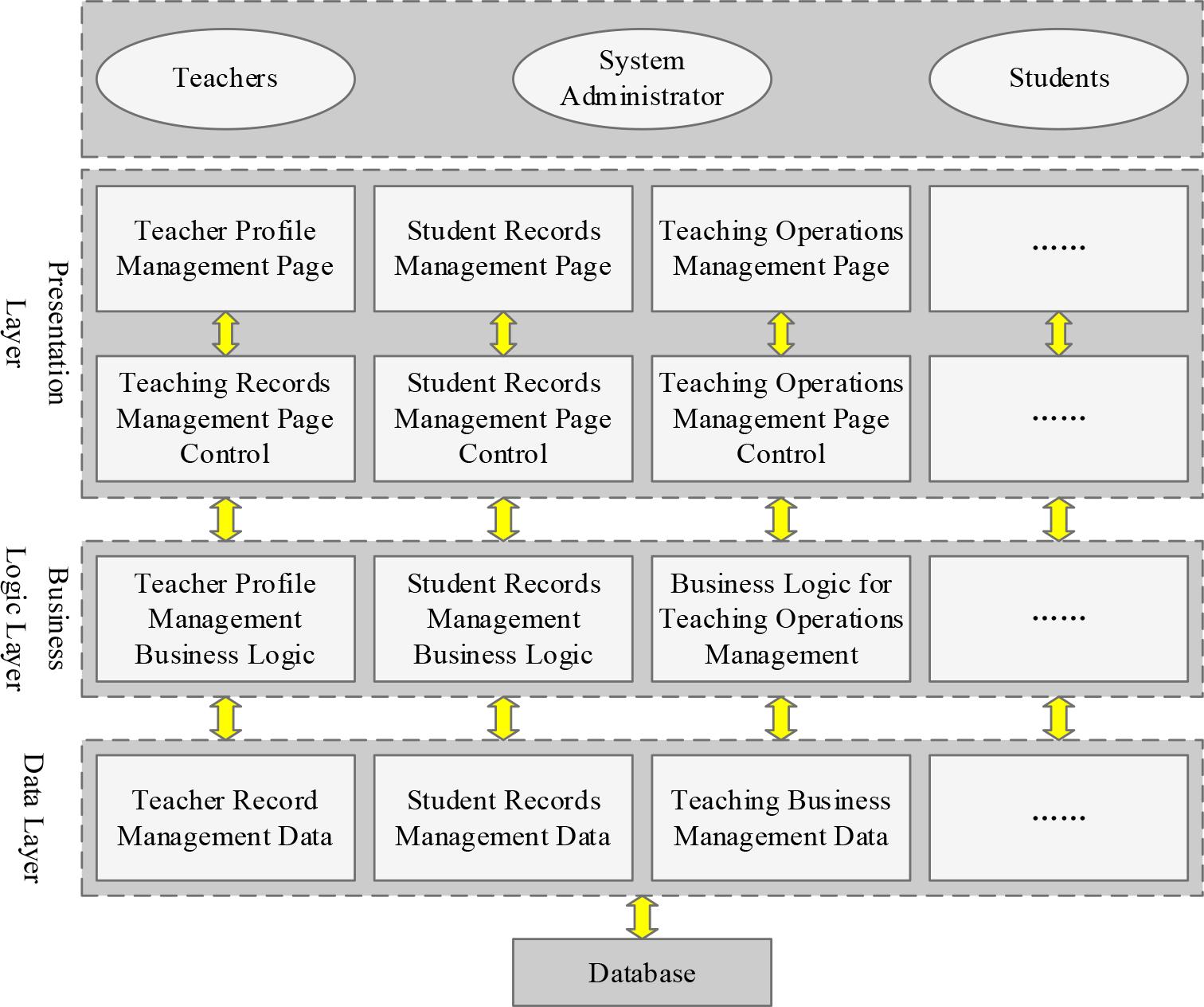 The file management system researched and developed in this paper is mainly to process and standardize the daily work of file management. Combined with the school’s business needs for file management, the system is set up into six major functional modules, i.e., teachers’ file management module, students’ file management module, teaching business management module, scientific research project management module, system maintenance module and data maintenance module, and each module is independent of each other. The overall functional structure of the system is shown in Figure 2.