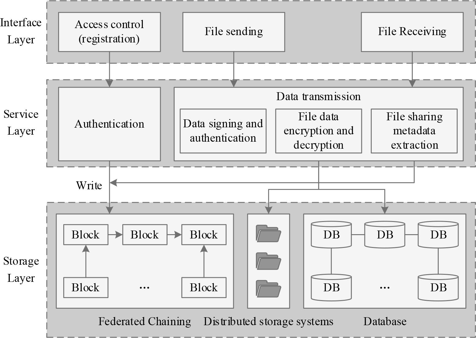 In this section, we present the architecture of the blockchain-based traceable digital archive sharing scheme. The system framework is shown in Fig. 3, and the architecture consists of a user interface layer, a smart contract layer, and a storage layer.