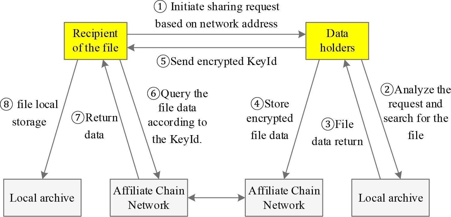 Identity registration and authentication: each digital archive joining the alliance chain has to register its identity to generate a digital identity, which is the basis for the archive to operate in the system. The archive that needs identity registration first generates a pair of public and private keys locally, in which the private key is stored locally. The public key is then sent to all members of the alliance through the network, and the alliance members receive the request and execute the identity registration smart contract to initiate the identity registration vote, and when more than half of the nodes agree, the identity registration is successful, and the public key is added to the local alliance chain configuration list for recording. The authentication module includes user identity and system authority authentication based on the federation chain. Data transmission: the data transmission module consists of file sending and file receiving. The user who joins the federation chain node has the network address and network port of other users on the federation chain. The sharing of data files first requires the file sharing requestor to initiate a sharing request through the network, and then the requested user determines whether to perform the sending or receiving operation by analyzing the specific request, and analyzes the specific file data to be shared through the request. The file sharing process is shown in Figure 4.