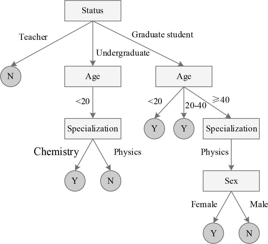 After pre-processing the data, according to the C4.5 algorithm, the attributes identity, gender, age and specialty are taken as the object attributes of the algorithm, and the attribute “whether to visit frequently” is taken as the target attribute, and the attributes are sorted one by one by applying the meaning of the rate of information gain, and the attribute with a high rate of information gain is selected as the test attribute, and a root node is constructed, and this attribute is used as a marker to construct a branch for each value of the decision tree recursively. Using this attribute as a marker, we build a branch for each attribute value, and recursively build a tree to construct a corresponding decision tree, the specific processing of the algorithm is as follows. The attribute “identity” is chosen as the root node of the decision tree because it has the largest information gain rate value. For each branch, the above steps are repeated to generate the decision tree, and the final decision tree is shown in Figure 6.