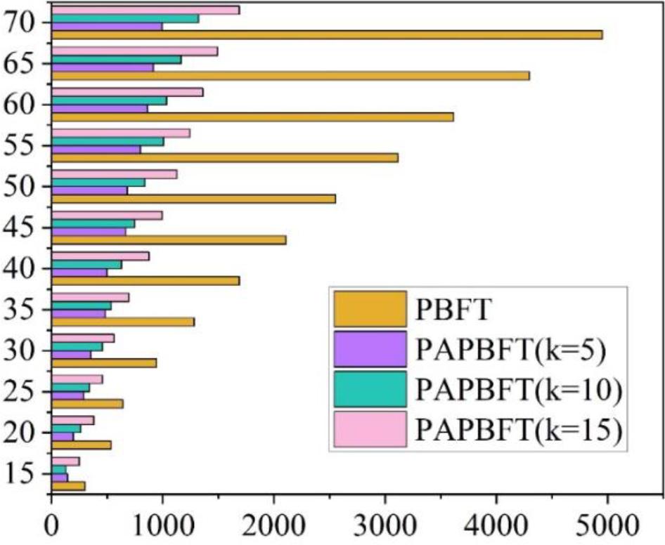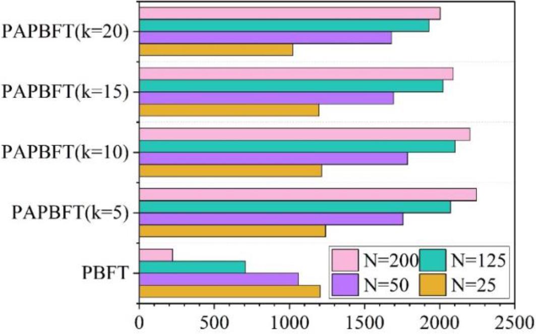 The experiment uses docker containers as the isolation technology. Due to the lightweight nature of Docker containers, thousands of containers can be run in a single machine environment. Multiple node containers are started based on the customized Docker image using Docker commands. Each container represents a consensus node, which collectively constitutes the consensus domain. The experiment is conducted using the Golang programming language and supports multiple concurrent program design schemes. The Golang programming language is used and simulation tests are conducted using JetBrainsGoLand version 2023.1.2. Golang provides efficient concurrent program design solutions and supports multi-threaded work modes, which facilitates distributed consensus algorithm implementation. Multi-computer network communication is implemented in the same LAN for consensus process simulation. This experiment compares the throughput of traditional PBFT algorithm as well as PAPBFT under different number of groupings based on the number of nodes, the number of nodes are taken as 25, 50, 125 and 200 respectively and the PAPBFT groupings are taken as 5, 10, 15 and 20 to draw the histograms and analyze the data comparatively and the throughput when N and K are taken at different values is shown in Fig. 8. According to the above shown, the throughput of PAPBFT consensus algorithm increases as the number of nodes N increases. From this point of view, the larger the number of consensus nodes, the larger the throughput of the system, which greatly increases the scalability of the university file management framework. As can be seen from the figure, the throughput of the traditional PBFT consensus algorithm gradually decreases with the increase of the number of nodes, when N=25, the PBFT throughput is 1250, when N=200, the PBFT throughput is 215. The improved consensus algorithm effectively alleviates the problem of the obvious decrease in throughput due to the continuous increase of the number of nodes, and is suitable for application in the university archive management framework.