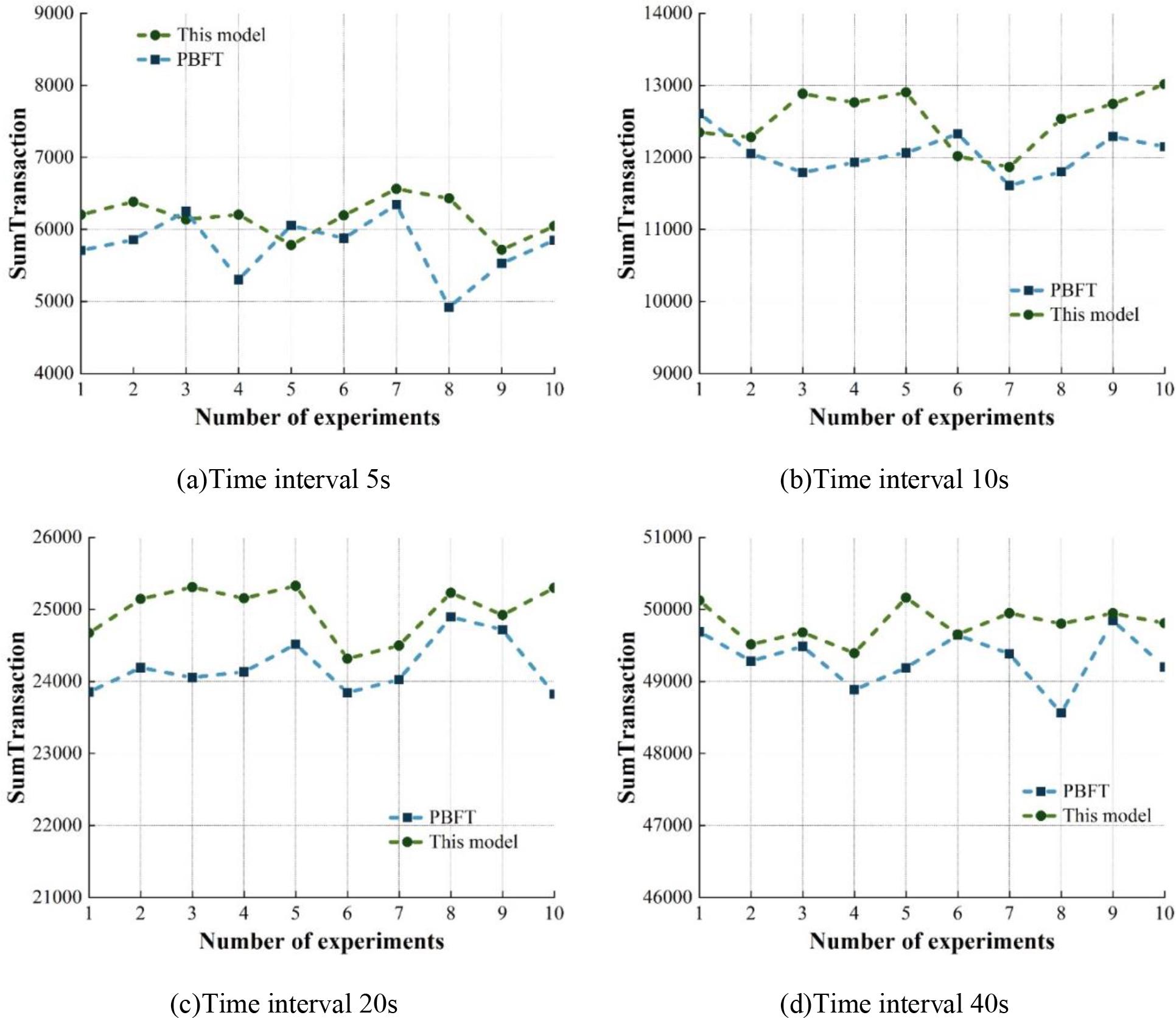 In this paper, we simulate four blockchain systems running at different time intervals of 5s, 10s, 20s and 40s. each time interval is experimented 10 times, and the results are shown in Fig. 5. Where (a)~(d) are the results of experiments with time intervals of 5s, 10s, 20s and 40s, respectively.