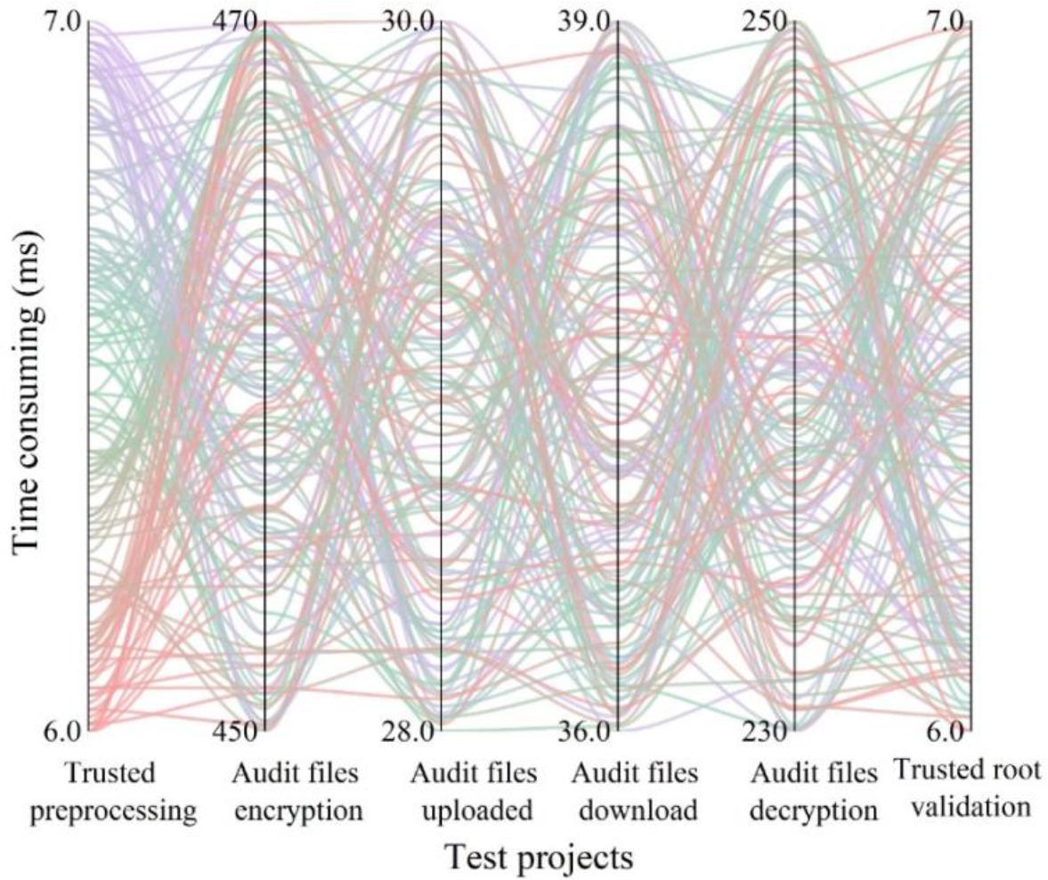 This section analyzes the performance test of the data owner’s rights protection system under blockchain mentioned above. The test includes the time consumption of six indicators: trusted preprocessing, audit file encryption, audit ciphertext upload, audit ciphertext download, audit file decryption, and trusted root verification.