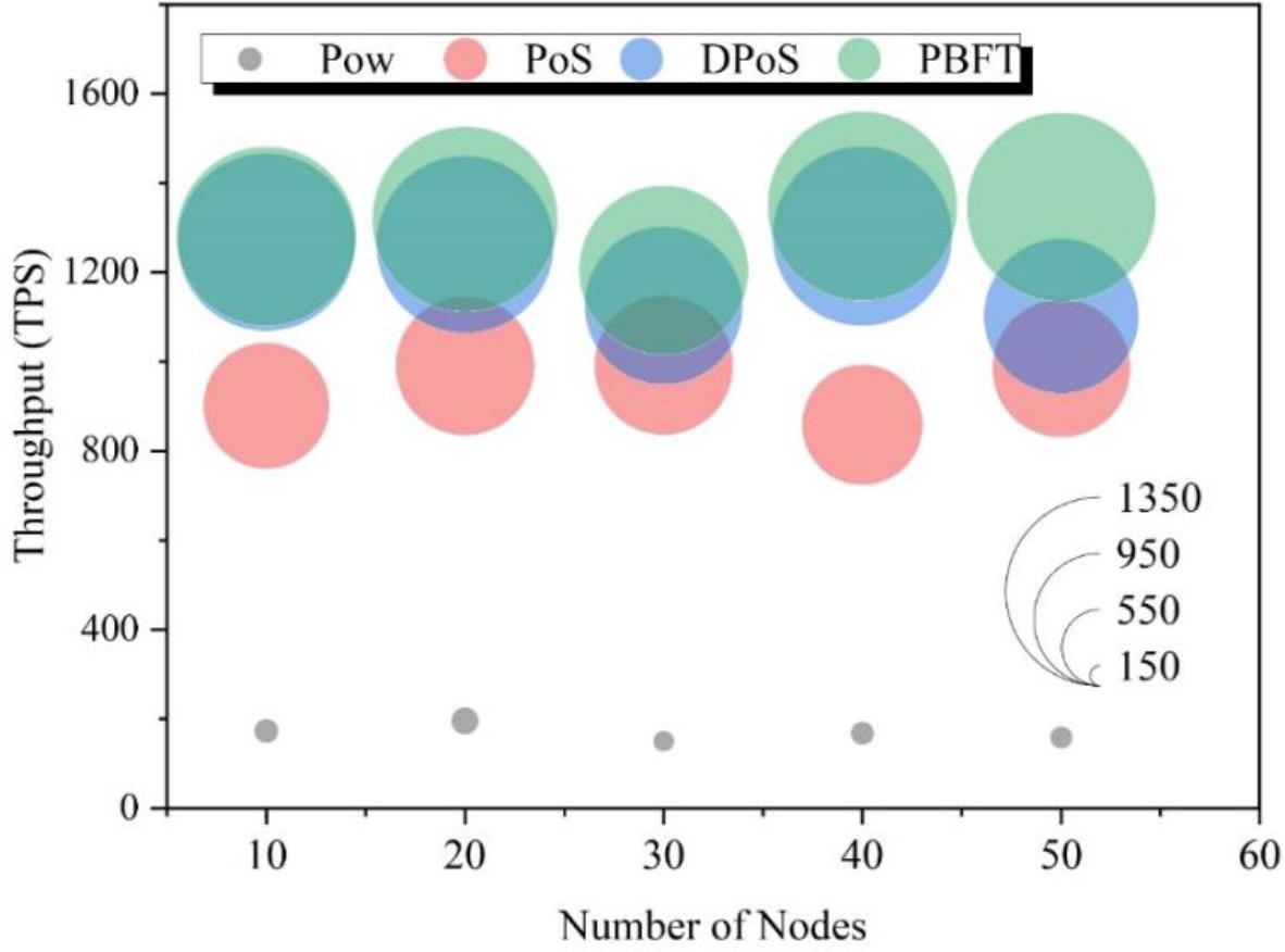 In order to analyse the performance of the consensus algorithm in this paper, the following is a comparative analysis of this algorithm with other algorithms in terms of throughput. In testing the throughput performance, the experimental environment is kept the same, and the number of nodes is set to increase from 10 to 50. The comparison algorithms are PoW, PoS, and DPoS.