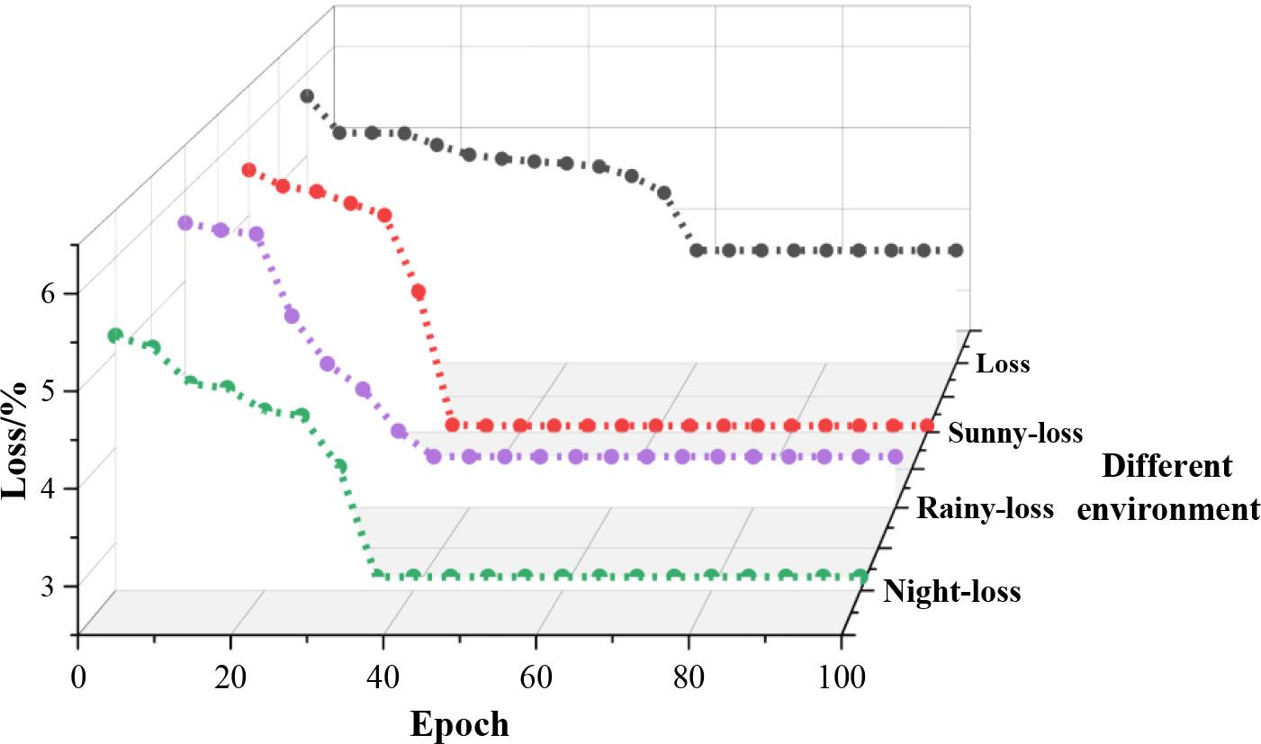 The samples in the BDD100K dataset are divided into three different environments: sunny, rainy, and night. Figure 3 shows the training loss curves of the model, in which the black curve is the loss curve of the original YOLOv5 road target detection algorithm network training, the red dotted line is the loss curve of this paper’s YOLOv5s-CBC-based road target detection algorithm network training in a sunny environment, the purple dotted line is the loss curve of the loss curve for network training of YOLOv5s-CBC based road target detection algorithm in rainy day environment in this paper, and the green dotted line is the loss curve for network training of YOLOv5s-CBC based road target detection algorithm in night environment in this paper. The loss curves show that the YOLOv5s-CBC-based road target detection algorithm applicable to different environments in this paper converges faster; basically, 35 iterations will complete convergence, and the YOLOv5 road target detection algorithm needs 60 iterations to complete convergence.