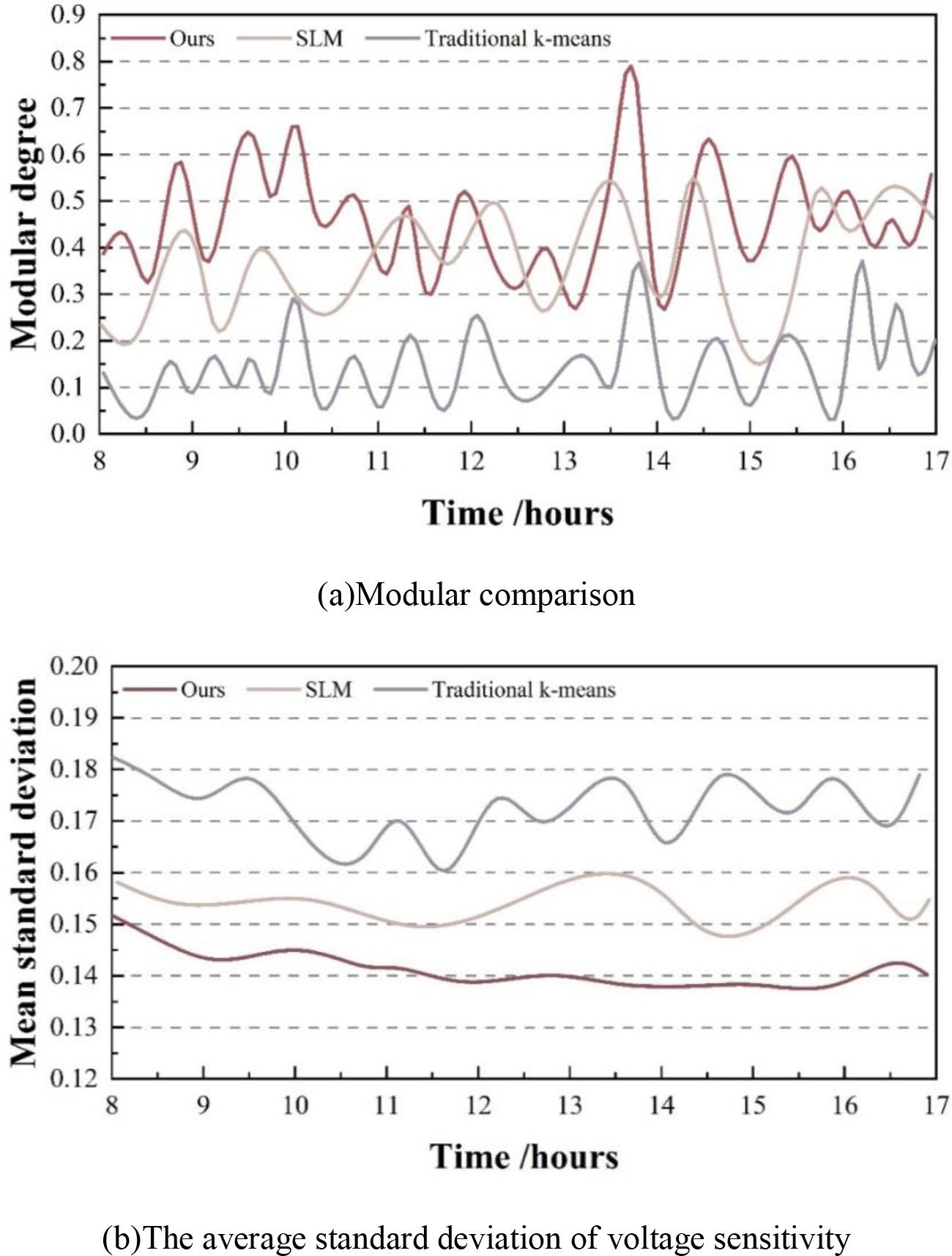 1) This paper analyzes the optimal scheduling effect of this paper’s cluster delineation by comparing the two methods of K-means traditional clustering algorithm, SLM algorithm and the improved method of this paper in terms of the comparison of the modularity degree, the average standard deviation of the voltage sensitivity and the average standard deviation of the reactive power adjustable control capacity. Among them, the module degree of this paper’s algorithm is between 0.27 and 0.80, which is better than the other methods, proving that the proposed algorithm of this paper has better division results. On the other hand, the standard deviation of sensitivity of this paper’s improved method is reduced to within 13.5-15.1% on average, and the standard deviation of controllable capacity is reduced by less than 40% on average, which is also better than other methods. It further indicates that the improved algorithm in this paper performs better in power cluster segmentation compared to other traditional clustering algorithms.