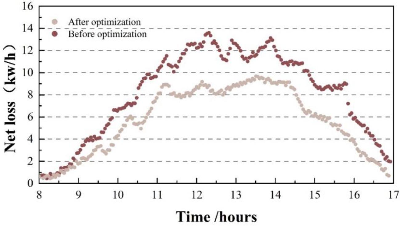Comparison of global regulation effect before and after optimization is shown in Fig. 5, the highest network loss of one day distribution network before optimization is 13.9Kw/h, and the average hourly loss is 8.107Kw/h. The average hourly loss after optimization is 5.717Kw/h, and after optimization of this paper, the average hourly loss is reduced by 2.39Kw/h compared to optimization, which further verifies the application effect of the method of this paper.