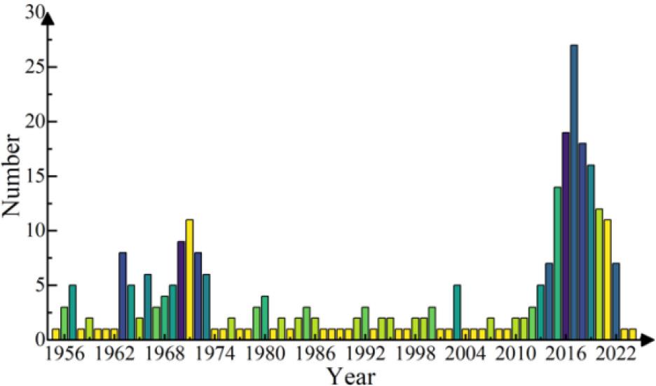 In order to deeply analyze the hot topics and cutting-edge themes in the field of research on the History of Zen Buddhism of Hu Shi from 1955 to 2024, it is necessary to first sort out and summarize the current status of research in the field of research on the History of Zen Buddhism of Hu Shi in this time period, and depict the overall trend of research on the History of Zen Buddhism of Hu Shi in the environment of the times. Changes in the number of publications is an important indicator to measure the development trend of a research topic in a specific time period, which can reflect the overall development trend of the research field as well as the development status in different periods, and is of great significance in analyzing the development dynamics and predicting the future trend. In this paper, 288 documents in the field of History of Zen Buddhism of Hu Shi retrieved from 1955 to 2024 are statistically analyzed, so that the distribution trend of the number of publications in the field of History of Zen Buddhism of Hu Shi between 1955 and 2024 is shown in Figure 1.