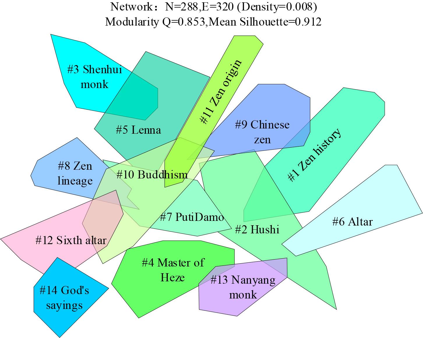 Each cluster has a label, closely related keywords are clustered together one by one by a specific algorithm, and each keyword is assigned a value, the class is represented by the largest value in the same cluster, and the clustering label is thus generated. There are 14 irregular regions in the figure, each of which corresponds to a label, indicating that the keyword clusters are clustered together into 14 classes. They are #1 History of Zen Buddhism, #2 Hu Shi, #3 Monk Shenhui, #4 Master Hoze, #5 Lankavatara Sutra, #6 Tantan Sutra, #7 Bodhidharma, #8 Zen Lineage, #9 Chinese Zen Studies, #10 Buddhism, #11 Origins of Zen, #12 Sixth Patriarch Altar Sutra, #13 Nanyang Monk, and #14 Quotations from Shenhui.