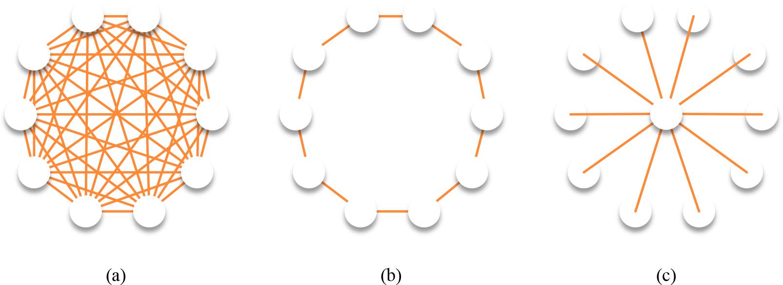 Regular networks are a special type of complex networks with highly ordered and regular connection patterns between nodes. Three kinds of coupling networks are shown in Fig. 2 (Figs. a~c are global coupling network, nearest neighbor coupling network and star coupling network, respectively).