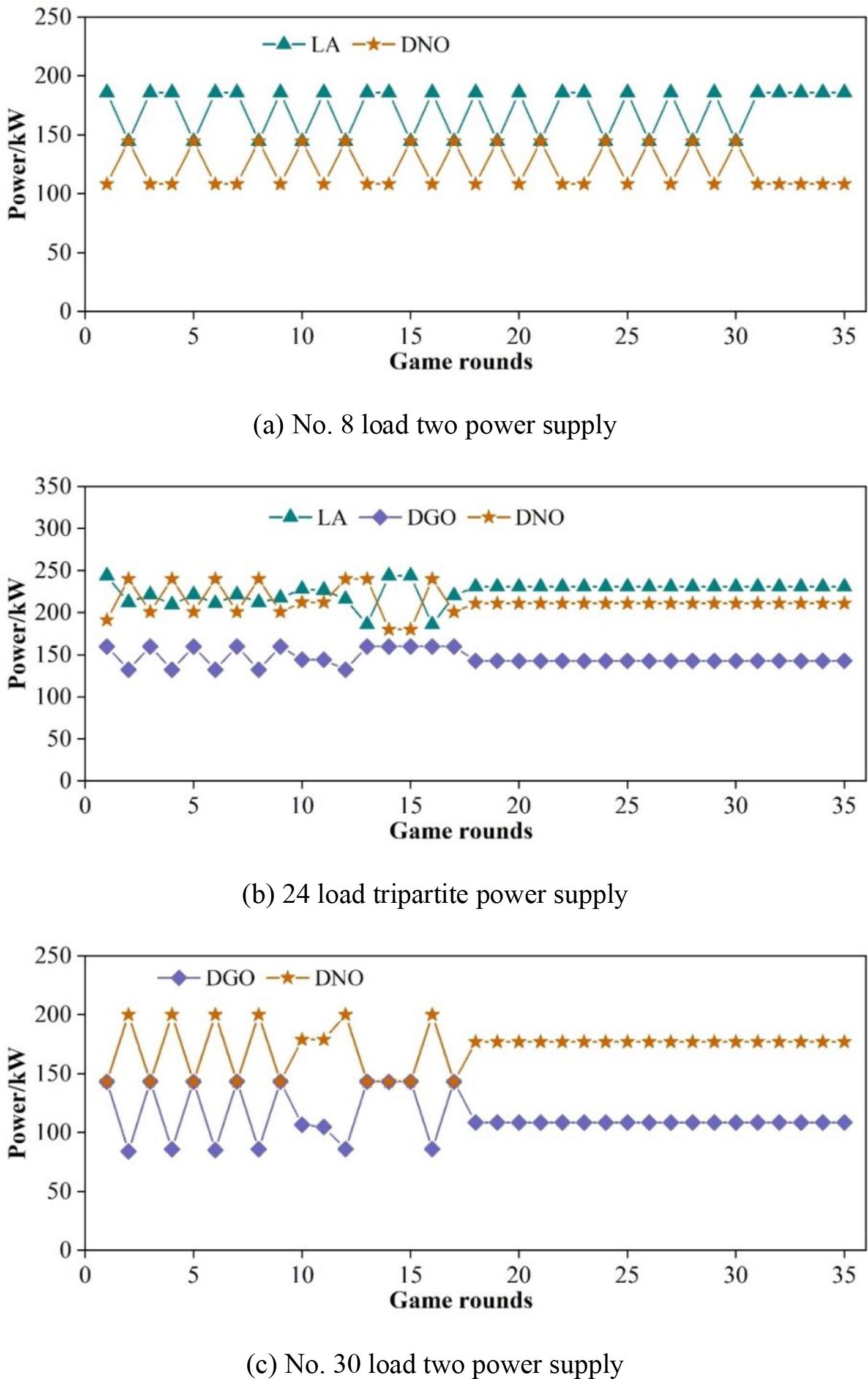 Scenario 3 adopts game bargaining, where all three parties have bargaining rights, and the load supply power and benefits obtained by the three parties in each round of the game for a typical time period of