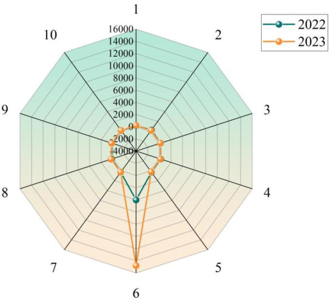 The case types in the dataset are analyzed by making a visual statistical graph, and the specific case types are divided as shown in Figure 4. It can be concluded that the case types in 2022 and 2023, theft crime as the main type of crime, the number of crimes is much higher than other types of crime, the number of theft crimes in 2023 more than 12,000, the number of other crimes in 2022 and 2023 is relatively stable, the experiment was initially selected to focus on a relatively large amount of data to carry out a study of the theft crime data.