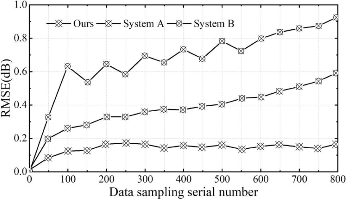 From the figure, it can be seen that the overall trend of the RMSE curve under the monitoring method based on this paper is relatively smooth, and its fluctuation range is between [0.127,0.165], and the mean value of the RMSE is 0.139dB, which is the smallest change in amplitude as well as the value of the error among the three curves. The other two methods have relatively high error amplitudes, large differences in values, and a wide range of variations, and the overall accuracy of monitoring is lower compared to the methods presented in this paper. The other two methods used to monitor students’ physical training failed to effectively reject interference data and were too dependent on external signals. This leads to a large amount of noise data in the sensor, interfering with the normal work of the transmission mechanism, increasing the signal transmission delay, and affecting the accuracy and timeliness of the monitoring of students’ physical training. Through the technology to achieve effective monitoring of student physical training data in college physical education, so as to provide data support for teachers to analyse the physical fitness level of students, but also to optimize the physical training strategy of students to provide auxiliary decision-making and guidance.
