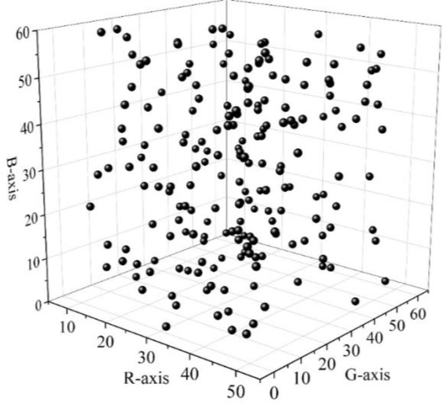 The extraction of colour features (dominant colour) is generally done using a colour clustering algorithm. Figure 2 and Figure 3 for the basic principles of colour clustering. Figure 2 shows the distribution of all pixels of “Sleeping Venus”in RGB colour space, and Figure 3 shows the distribution of pixels of “Sleeping Venus”in HSV colour space. Here, the quantization level of R, G and B are all taken as 64, and the quantization level of H, S and V are taken as 50. Notice that the H component in HSV space is continuous, i.e., level 1 and level 50 are adjacent to each other in terms of colour (both red), and it can be seen that the pixel points are clustered in both colour spaces, but the clustering patterns are not the same. The distribution of pixel points in the RGB space is more tight and concentrated; the three axes are of equal status, and the anisotropy is different. The three axes are equal and isotropic; G and B are in the interval [0,60], and R is in the interval [0,50]. In contrast, the distribution of pixels in HSV space is somewhat regular, and the projections of pixel points on the H-axis are all concentrated around a few values, which is quite different from the nature of the S-axis and the V-axis, i.e., the distributions are anisotropic.