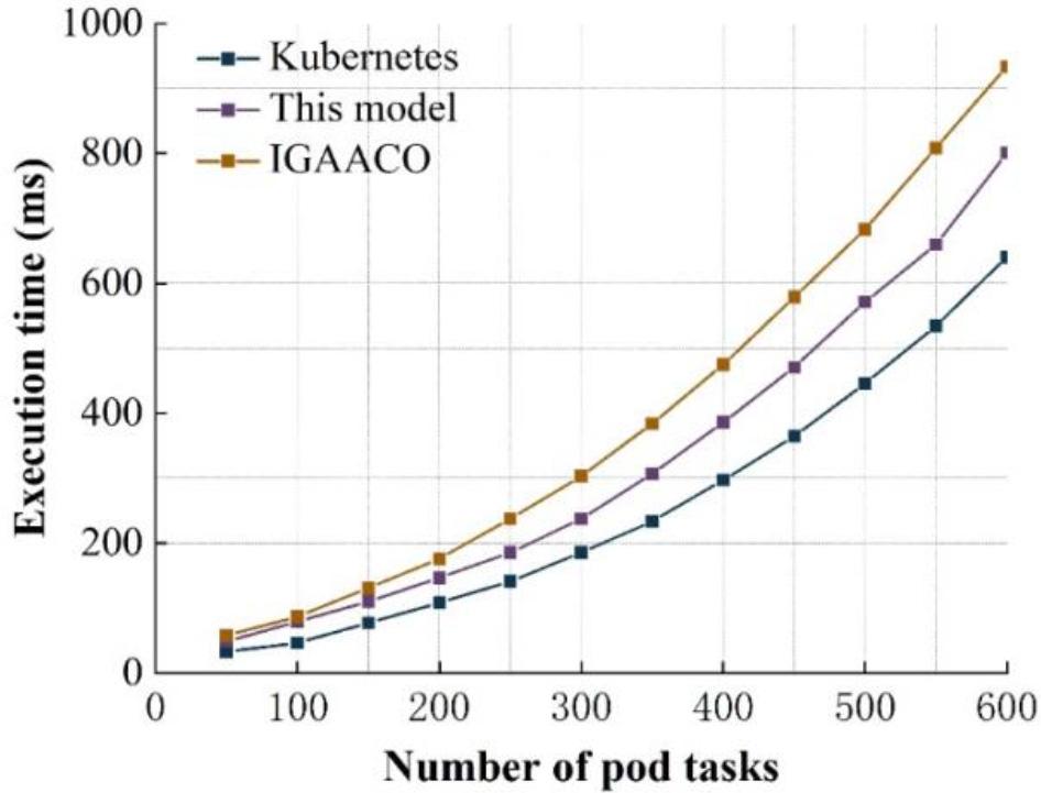 From the figure, it can be seen that as the number of pods increases, the scheduling time shows a gradual upward trend. However, the overall scheduling time is shorter due to the relative simplicity of the Kubernetes default scheduling policy algorithm. The resource scheduling time of the IGAACO algorithm and the model in this paper is relatively close when the number of Pod tasks is small, but the scheduling time gap increases as the number of Pod tasks keeps increasing. In the case of an increasing number of pod tasks, the model presented in this paper requires less scheduling time.