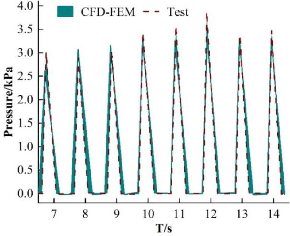 The loads at measurement point P4 obtained by using the two-way fluid-solid coupling method of test and CFD-FEM are shown in Fig. 5. As can be seen from Fig. 5, the hull thumping cycles of the two ships are consistent, and the amplitude of the load change triggered by the thumping action is similar.