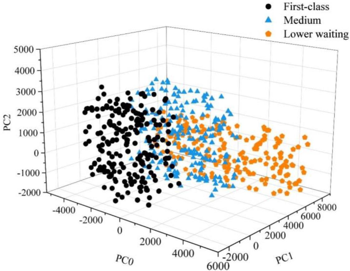 The extracted raw spectral data were visualized using the PCA algorithm, which can reflect the main characteristics of different tobaccos, and the results of the characteristic visualization are shown in Fig. 2, with the black circle being the superior tobacco-perfected leaf level 1, the blue triangle being the medium tobacco-smooth leaf level 1, and the orange pentagon being the inferior tobacco-green and yellow tobacco level 1. The three types of tobacco have relatively independent spatial distribution, which can visualize that these three types of tobacco are classifiable and have strong theoretical guidance for subsequent classification.