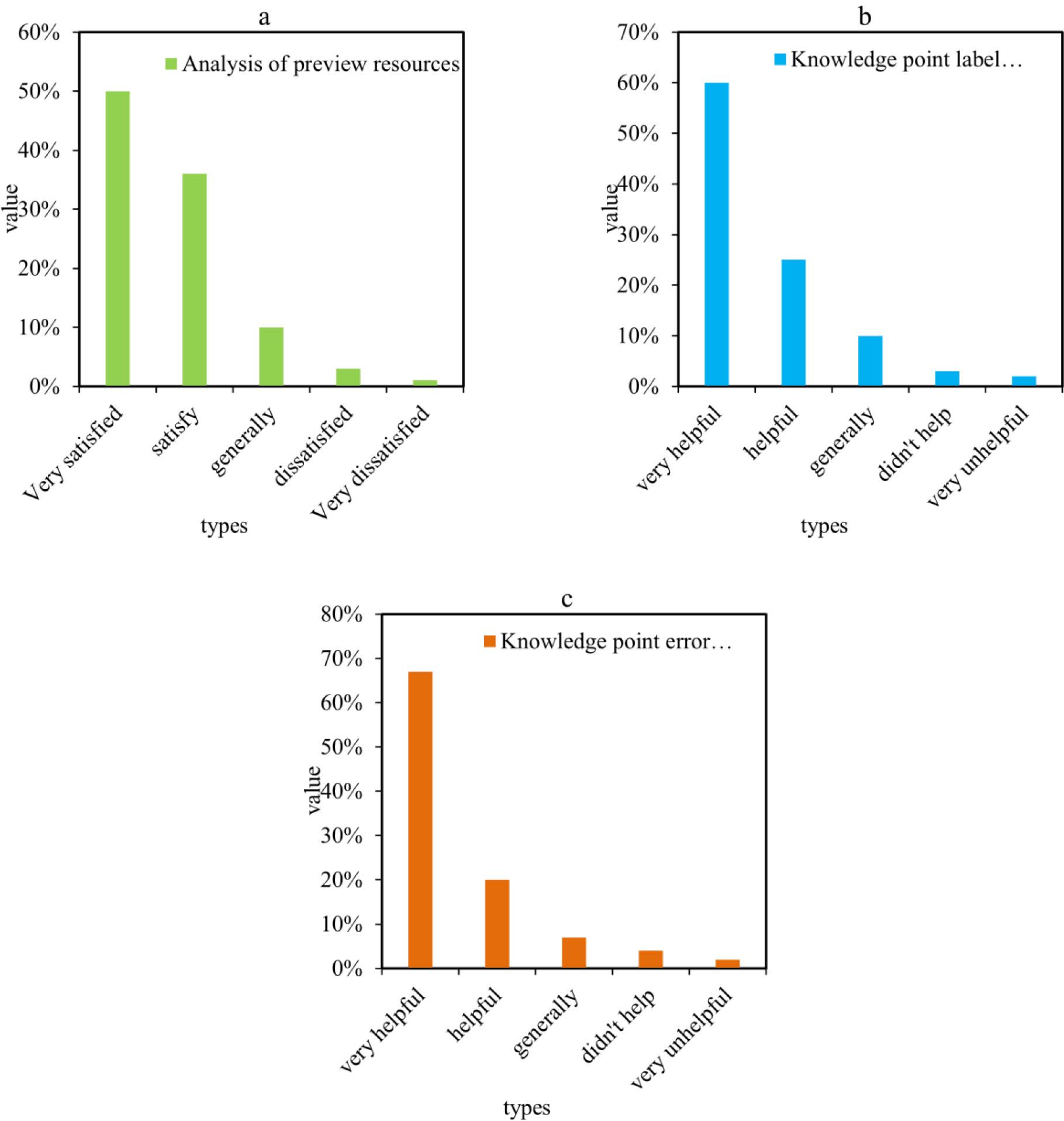 Figure 8(a) is the analysis of the preview resources, and Figure 8(b) is the analysis of the knowledge point label, while Figure 8(c) is the analysis of the wrong question of the knowledge point. Among them, 86% of the subjects were satisfied with the teachers' various preview resources, which indicated that personalized preview resources can well meet students' learning needs and can effectively improve the preview effect. 85% of students believed that by labeling various resources, they can effectively improve their learning efficiency, so that all resources were labelled according to the subject knowledge system tree. Thus, teachers can accurately find matching knowledge points or chapters, and better provide personalized teaching assistance, thereby promoting students' learning. 87% of the students felt that the wrong question rework module was very helpful to their learning. Most students believed that the system can classify incorrect knowledge and provide corresponding exercises. This enabled students to review in a targeted manner and quickly eliminate weak points.